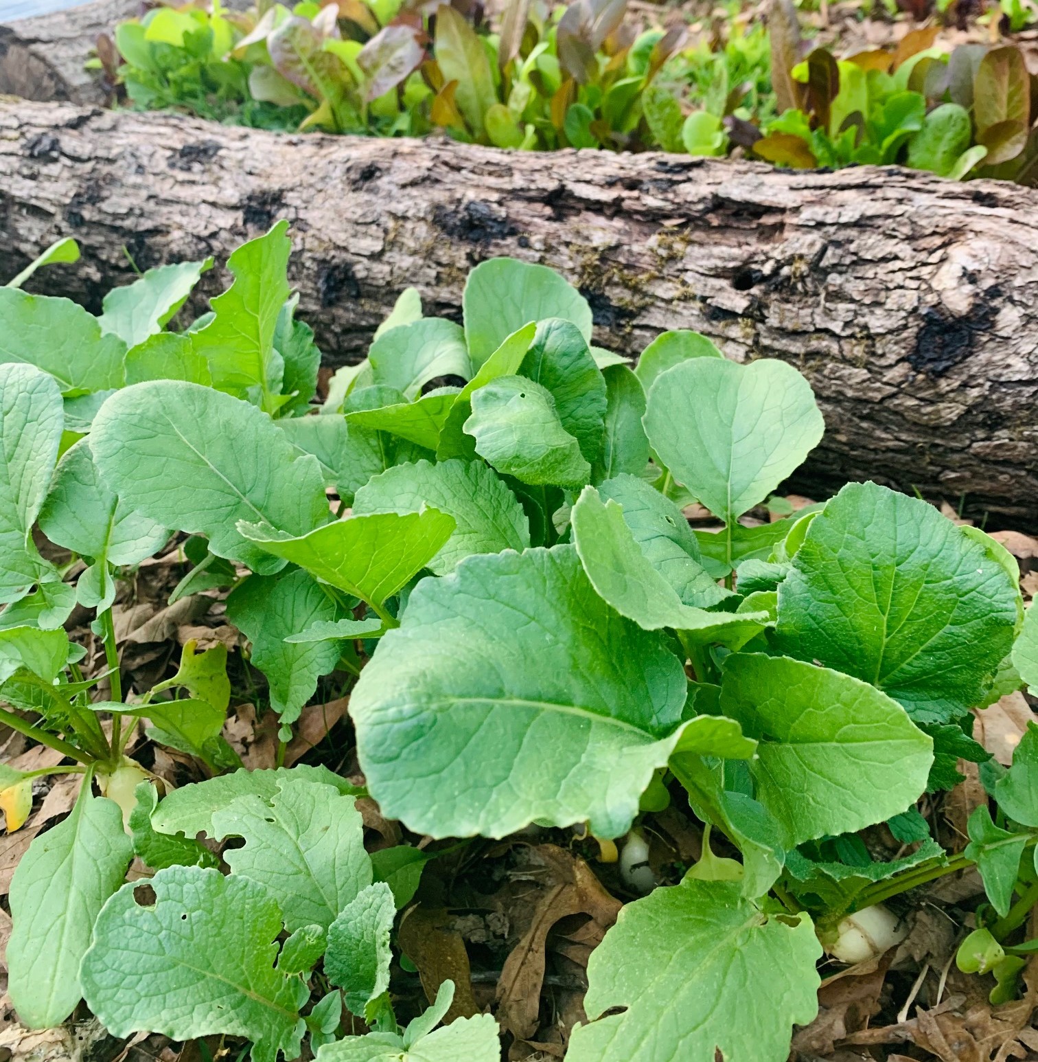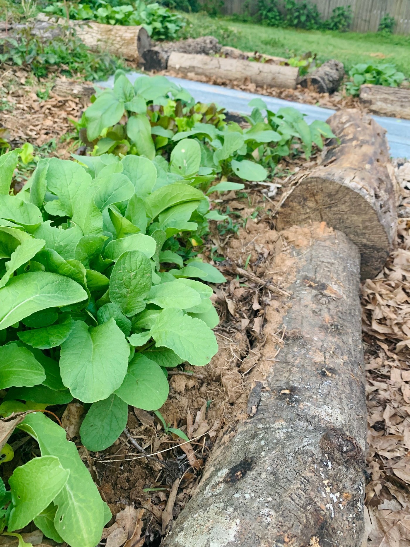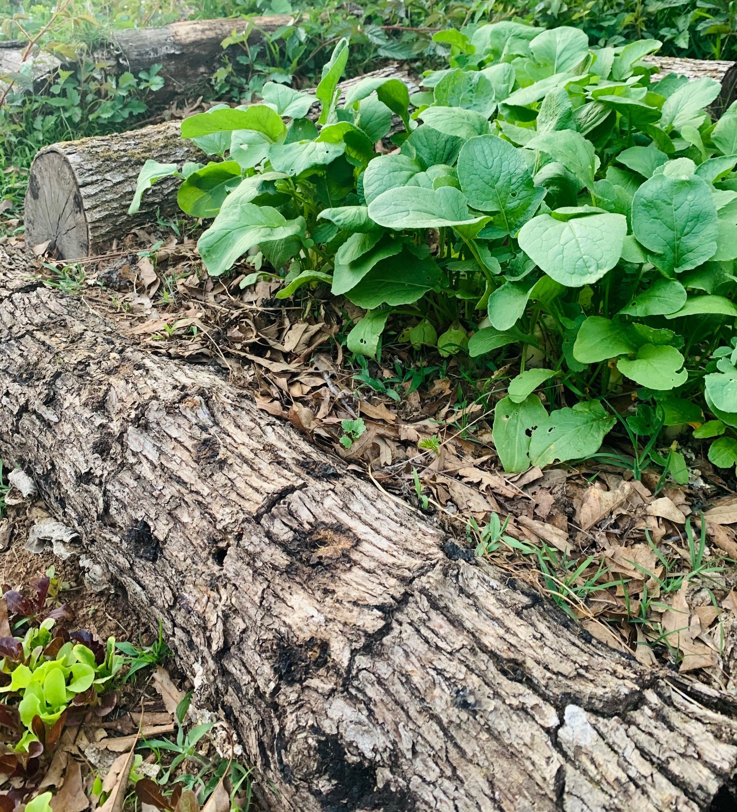 We have radishes and lettuce leafing out over these logs, no mushrooms yet but the conditions aren’t quite right. I hope the remaining mycelium will love the added moisture. They are partially covered by soil, leaf mulch, and radish leaves. Plus they are sure to be watered every other day.